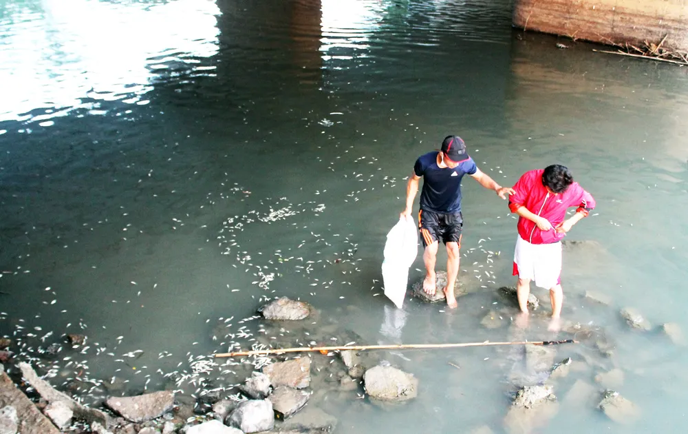 Sáng 30-4, Đoàn công tác của UBND huyện Tư Nghĩa do ông Huỳnh Ngọc Quận dẫn đầu đã đến tại hiện trường dòng sông Bàu Giang (đoạn chảy qua huyện Tư Nghĩa) để kiểm tra, tìm hiểu nguyên nhân cá chết hàng loạt tại đây, khiến người dân vô cùng hoang mang.