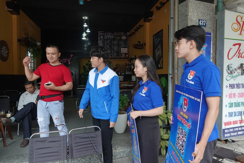 Tại quán cà phê trên đường Hà Huy Tập (quận Thanh Khê, TP Đà Nẵng), thấy tấm bảng to với màu sắc nổi bật và dòng chữ “Thư viện số”, nhiều vị khách trong quán cũng tò mò. Các bạn đoàn viên nhanh chóng hướng dẫn mọi người quét mã, truy cập thư viện ảo và lựa chọn “sách trên kệ” theo sở thích.