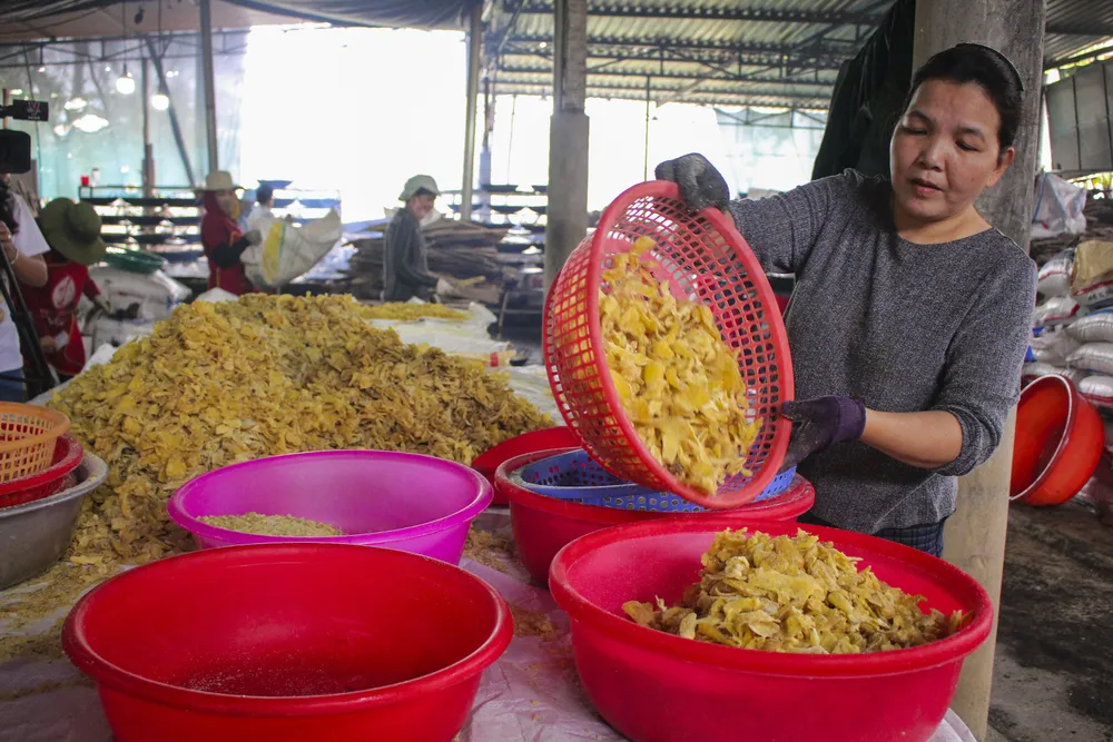 Mứt gừng rim xong được đổ ra nơi thông thoáng rồi dùng đũa để tách không để các lát dính vào nhau