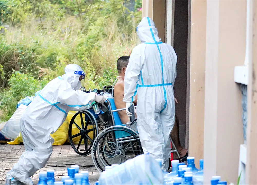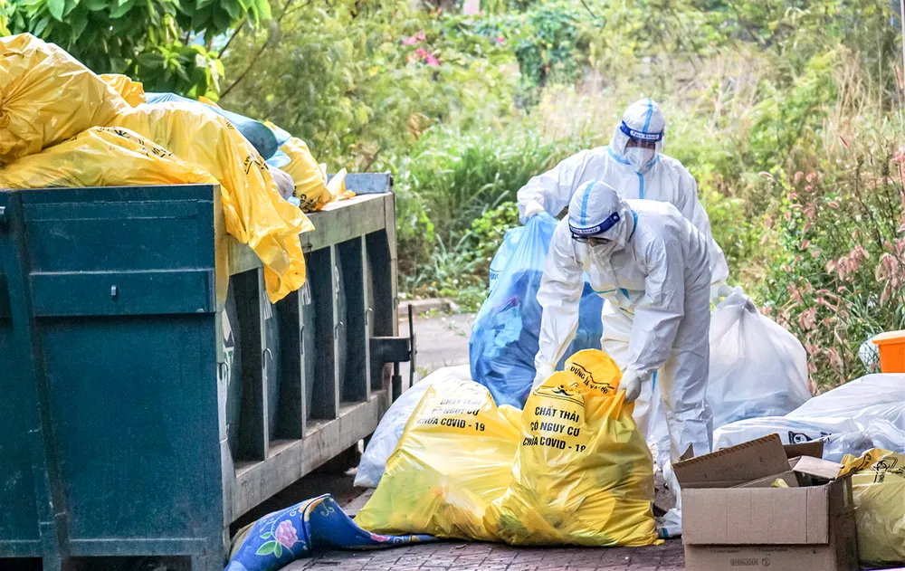 Nhóm chiến sĩ dân quân đi thu gom rác thải y tế từ tầng 12 xuống tầng trệt và đưa ra xe