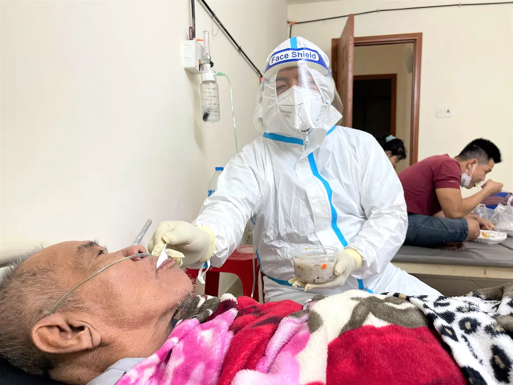Nhiều bệnh nhân lớn tuổi, không có người thân bên cạnh được các chiến sĩ dân quân thay ca chăm sóc từ bữa ăn đến vệ sinh