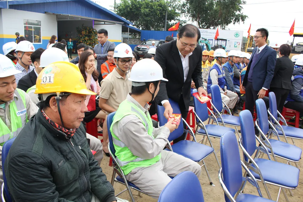 Ông Lê trung Chinh lì xì cho các công nhân đang thi công nhân dịp đầu năm