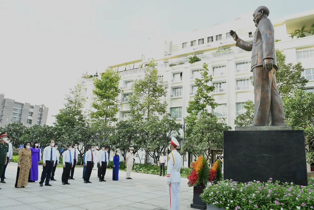 Các đồng chí lãnh đạo TPHCM dâng hoa Chủ tịch Hồ Chí Minh tại Công viên tượng đài Chủ tịch Hồ Chí Minh, sáng 1-9-2021. Ảnh: VIỆT DŨNG