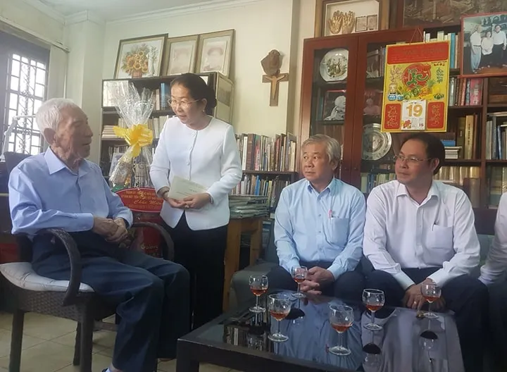 Đồng chí Võ Thị Dung và các thành viên trong đoàn chúc mừng Giáng sinh Nhà nghiên cứu Nguyễn Đình Đầu. Ảnh: HOÀI NAM