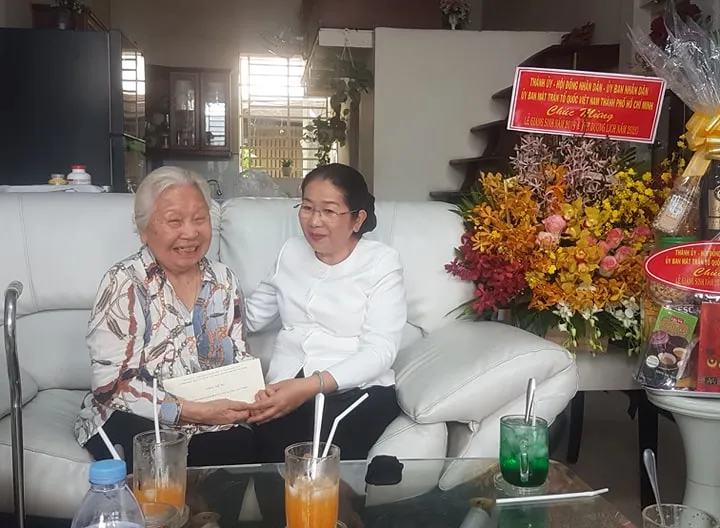 Phó Bí thư Thành ủy Võ Thị Dung thăm hỏi thân mẫu Giám mục Nguyễn Anh Tuấn. Ảnh: HOÀI NAM