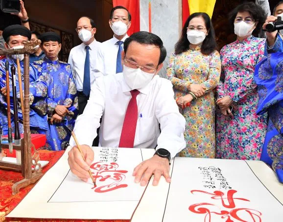 Bí thư Thành ủy TPHCM Nguyễn Văn Nên khai bút đầu xuân. Ảnh: VIỆT DŨNG