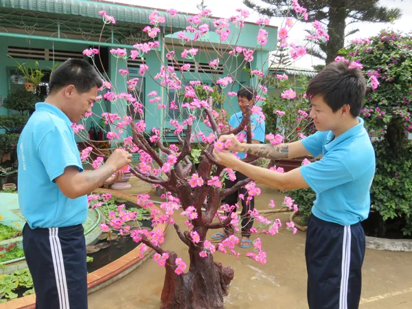 Học viên tại trường số 1 trang trí mai, đào chuẩn bị đón tết