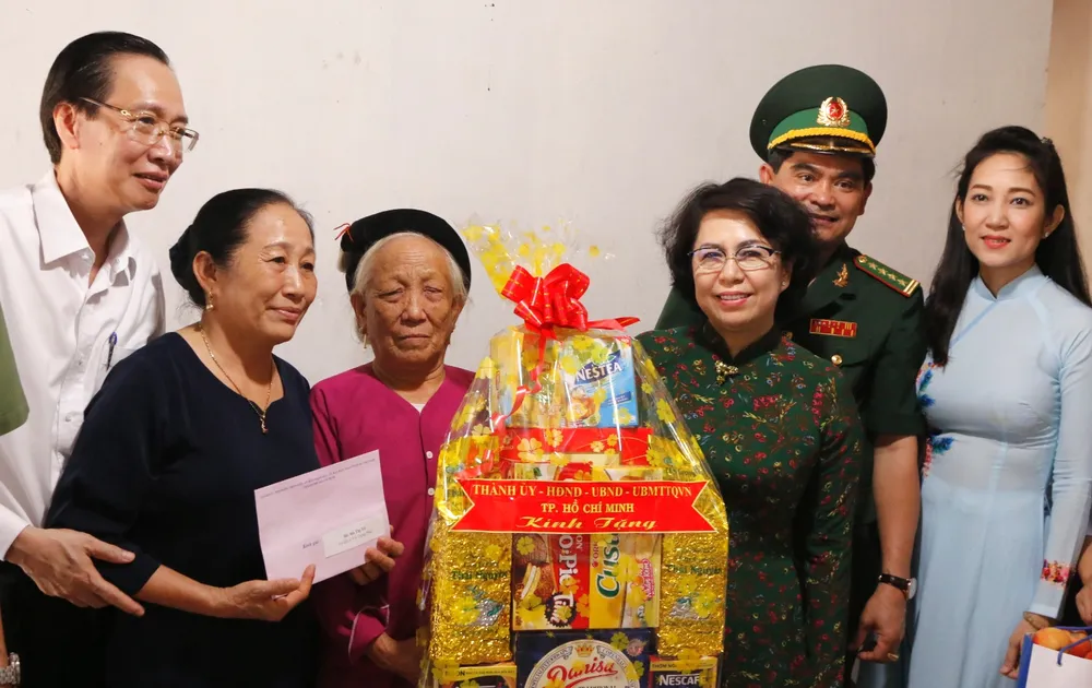 Cùng ngày, đồng chí Tô Thị Bích Châu, Ủy viên Ban Thường vụ, Chủ tịch Ủy ban MTTQ Việt Nam TPHCM dẫn đầu đoàn đại biểu Thành ủy - HĐND - UBND - Ủy ban MTTQ Việt Nam TPHCM đi thăm, tặng quà các gia đình chính sách.
