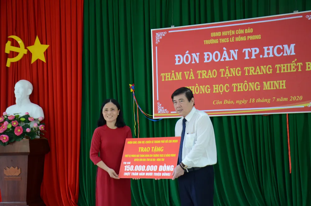 * Cũng trong ngày 18-7, đồng chí Nguyễn Thành Phong, Ủy viên Trung ương Đảng, Phó Bí thư Thành ủy, Chủ tịch UBND TPHCM dẫn đầu đoàn đại biểu TPHCM đã đến thăm và trao tặng trang thiết bị phòng học thông minh trị giá 150 triệu đồng tới Trường THCS Lê Hồng Phong (huyện Côn Đảo, tỉnh Bà Rịa - Vũng Tàu).