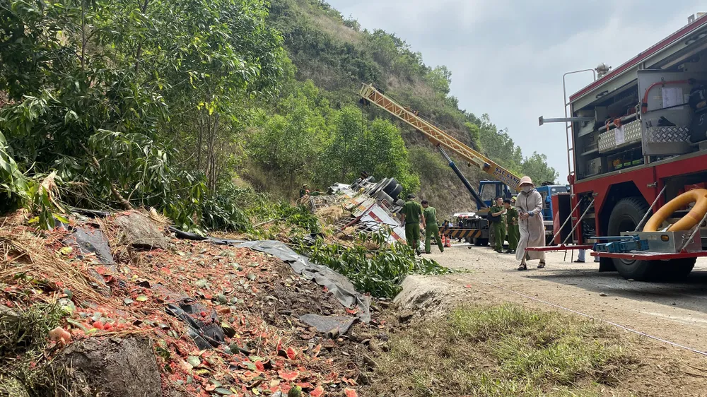 Tại hiện trường, xe tải bị lật vào vách núi bị biến dạng, toàn bộ dưa hấu trên xe dập nát, hư hại.
