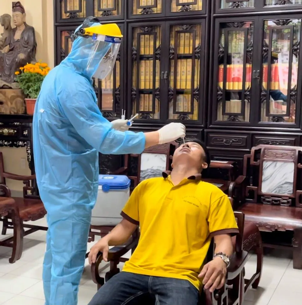 Nhân viên y tế Trung tâm Y tế Tân Bình lấy mẫu xét nghiệm Covid-19 phật tử phục vụ tại chùa