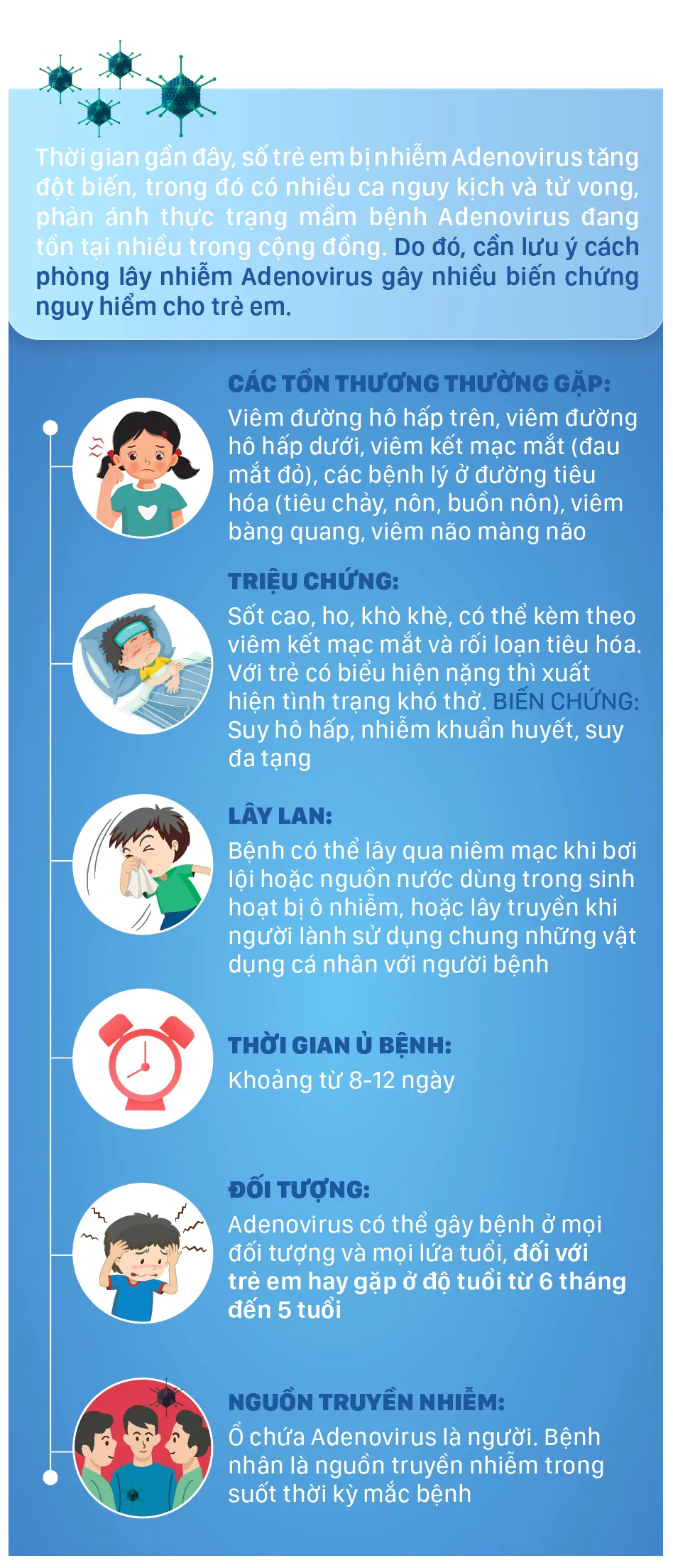 Thời gian gần đây, số trẻ em bị nhiễm Adenovirus tăng đột biến, trong đó có nhiều ca nguy kịch và tử vong, phản ánh thực trạng mầm bệnh Adenovirus đang tồn tại nhiều trong cộng đồng. Do đó, cần lưu ý cách phòng lây nhiễm Adenovirus gây nhiều biến chứng nguy hiểm cho trẻ em.