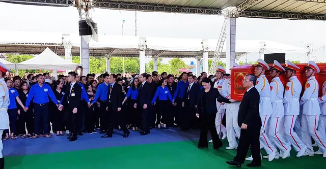 Quyền Chủ tịch nước Đặng Thị Ngọc Thịnh và Phó Thủ tướng Thường trực Trương Hòa Bình dẫn đầu đoàn đưa linh cữu Chủ tịch nước vào nơi an nghỉ cuối cùng.