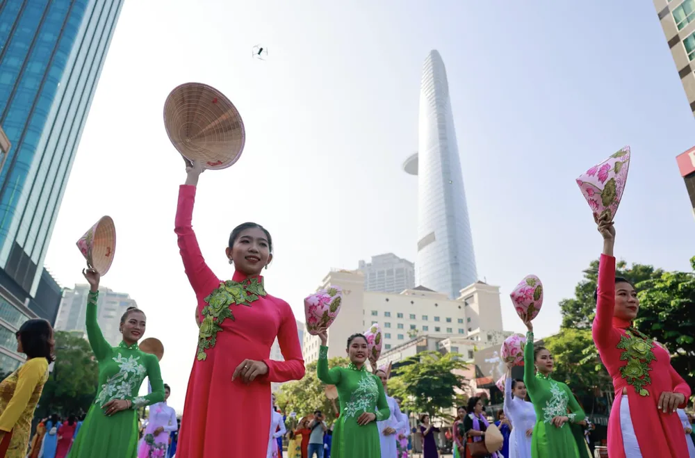 Các đại sứ cùng hàng ngàn người diễu hành áo dài trên phố đi bộ Nguyễn Huệ. Ảnh: BTC |