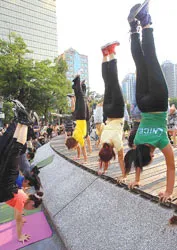 Những người tham gia được hướng dẫn “trồng chuối” đúng cách nhằm thúc đẩy tuần hoàn máu và tập thăng bằng.