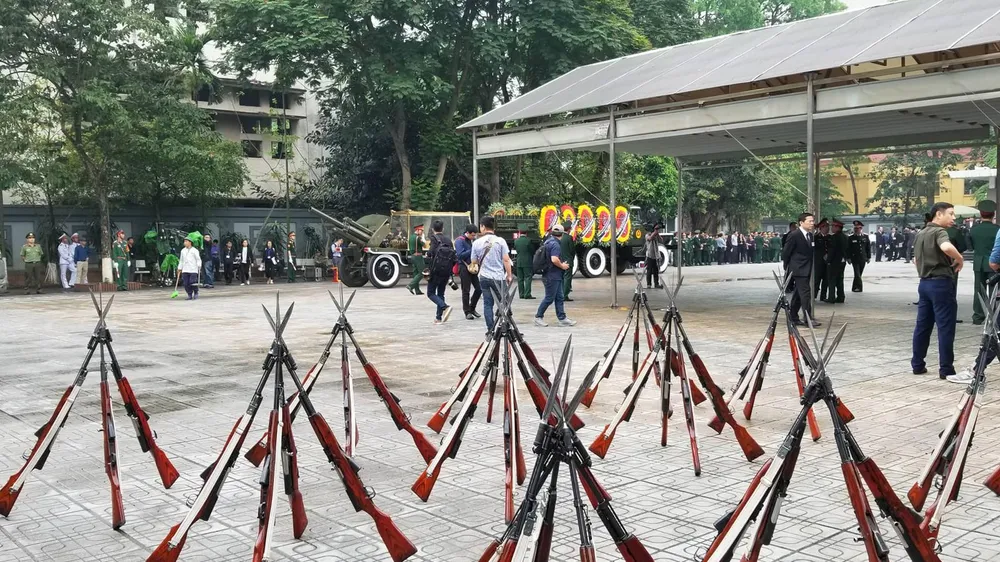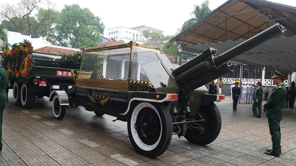Linh cữu Đại tướng Lê Đức Anh được đội nghi lễ cẩn trọng đặt lên cỗ linh xa, lá Quốc kỳ được phủ lên linh cữu.