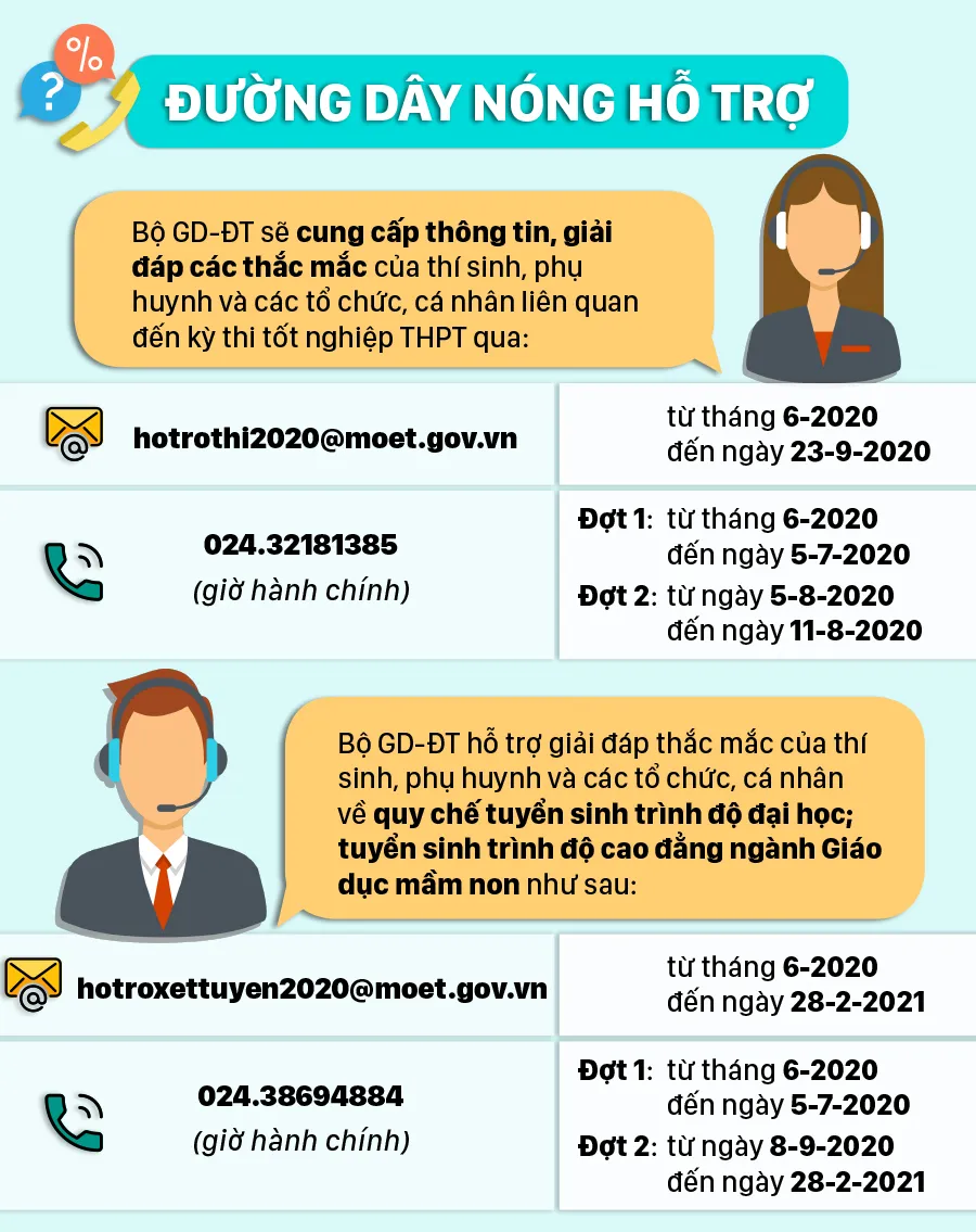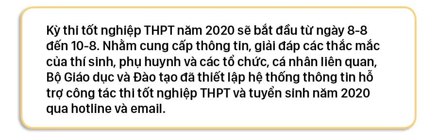 Kỳ thi tốt nghiệp THPT năm 2020 sẽ bắt đầu từ ngày 8-8 đến 10-8. Nhằm cung cấp thông tin, giải đáp các thắc mắc của thí sinh, phụ huynh và các tổ chức, cá nhân liên quan, Bộ Giáo dục và Đào tạo đã thiết lập hệ thống thông tin hỗ trợ công tác thi tốt nghiệp THPT và tuyển sinh năm 2020 qua hotline và email.