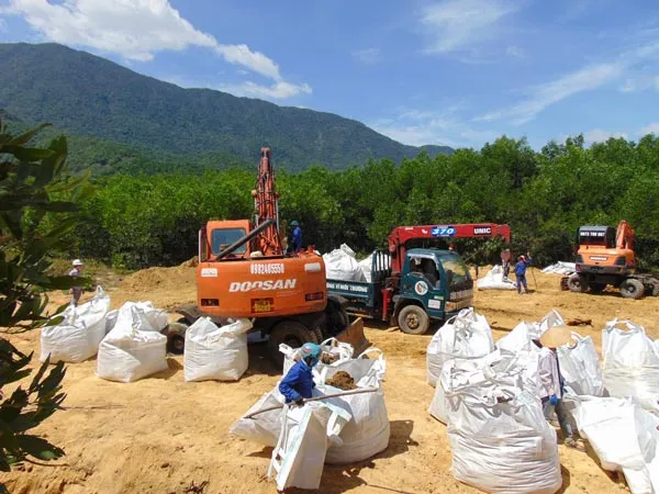 Cơ quan chức năng tiến hành đào, thu gom số chất thải của Formosa chôn lấp trái phép tại trang trại ở phường Kỳ Trinh, thị xã Kỳ Anh để đưa đến nơi an toàn. Ảnh: Dương Quang