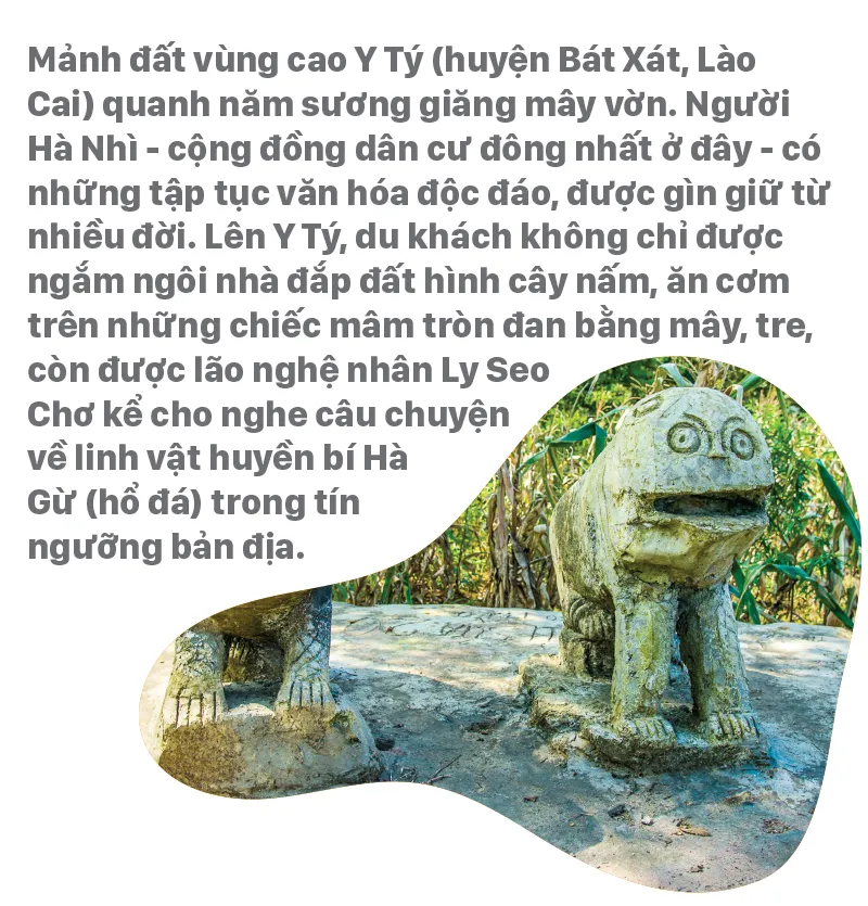 Đến đây vào các dịp lễ, tết du khách được ngắm những cô gái Hà Nhì kiều diễm trong bộ trang phục truyền thống với nhiều họa tiết trên quần, áo, khăn cầu kỳ, bắt mắt. Ghé thăm nhà dân bản, du khách sẽ được mời dùng bữa với những món ăn dân dã, ấm cúng trên chiếc mâm mây tre đan lạ mắt. Chiếc mâm độc đáo này gây ấn tượng mạnh bởi chúng có mặt tròn, chân đế xòe rộng giống với biểu tượng trống đồng Việt Nam… Đi sâu vào đời sống tín ngưỡng, tâm linh của người Hà Nhì ở Y Tý, du khách sẽ được nghe câu chuyện gắn với linh vật mang tên Hà Gừ (theo tiếng Hà Nhì, nghĩa là hổ đá), chỉ có ở mảnh đất này.