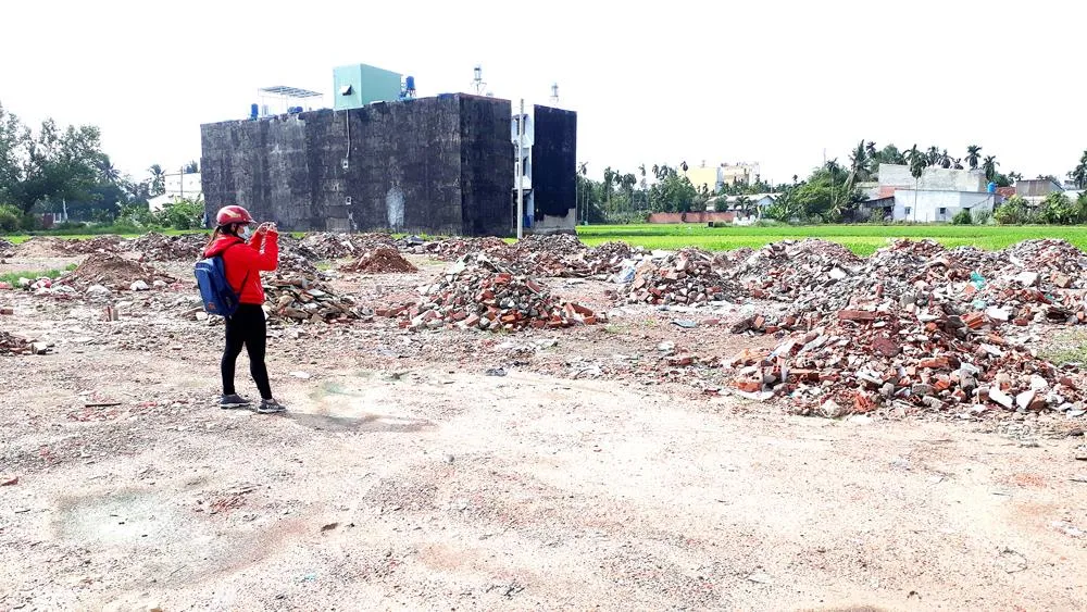 Trong vai người cần mua đất, tôi được khá nhiều cò đất tiếp cận tư vấn, trong đó có Loan, làm môi giới nghiệp dư ở quận 12, TPHCM. Cô này dẫn tôi đến một khu đất cách đường Hà Huy Giáp khoảng 1km, thuộc phường Thạnh Xuân, quận 12, rộng hơn 1.000m2, chia làm 31 lô, trong đó có 20 lô đã giao dịch thành công. Hiện trạng tại đây là một bãi đất trống mênh mông, đổ khá nhiều xà bần, chưa được san lấp, xung quanh là các ruộng rau muống của người dân vẫn còn xanh tốt. Mảnh đất được rao bán có mã số B-2 MPT 817, diện tích 55,4m2 với giá 900 triệu đồng, nằm đối diện với một công trình biệt thự mới hoàn thiện phần móng được xây lên để dẫn dụ khách hàng.