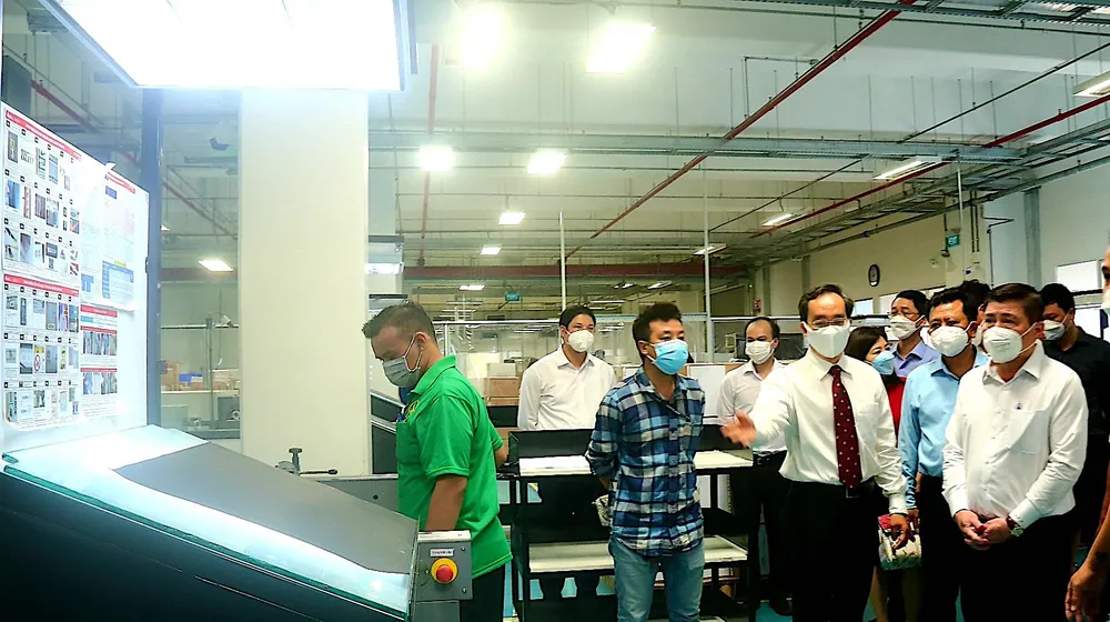 Đại diện doanh nghiệp trình bày với đoàn công tác về quá trình hoạt động của mình trong trạng thái bình thường mới
