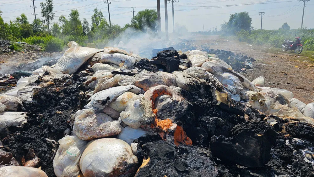 Theo ghi nhận, rác không chỉ bị vứt vương vãi đầy đường mà còn chất đống, đổ xuống kênh rạch cặp tuyến đường làm ô nhiễm dòng kênh. Có đoạn, rác được đốt cháy khói nghi ngút, bốc mùi khét lẹt khiến người đi đường nín thở. Rác thải nhựa bị đốt cháy chảy nhựa khắp nơi.