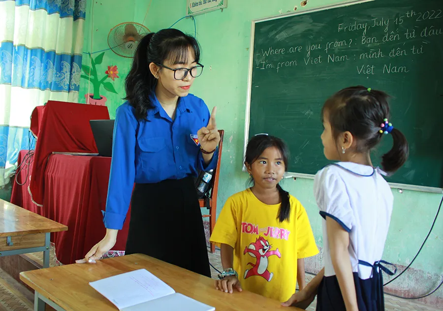 Cô giáo Trần Thị Hoàng Trâm, dạy lớp tiếng Anh chia sẻ: “Lúc đầu khi đoàn xã thực hiện cho học sinh đăng ký, tôi rất lo lắng liệu các em ở xóm Đèo có thể đi học, tuy nhiên cô giáo ở điểm trường lẻ là Đinh Thị Kem đã vận động được tất cả 14 em đến lớp tiếng Anh dù cho rất xa xôi. Các em học sinh xóm Đèo thuộc vùng dân tộc thiểu số nên tôi muốn góp phần công sức dạy tiếng Anh cho các em. Tiếng Anh có vai trò quan trọng, bước đầu tiên tạo cho các em niềm đam mê và sau khi lớn lên các em có thể tự học tiếng Anh, tôi mong các em có tương lai tốt hơn”.