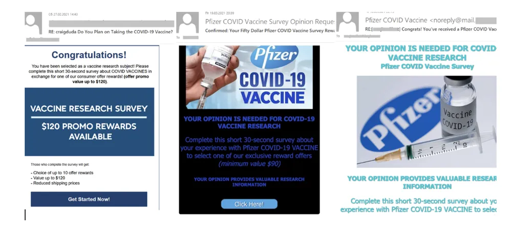 Để đặt lịch hẹn tiêm chủng, người dùng phải điền dữ liệu cá nhân của họ, bao gồm cả chi tiết thẻ ngân hàng, vào biểu mẫu. Kết quả, họ đã giao dữ liệu tài chính và cá nhân của mình cho những kẻ tấn công. Một cách khác để truy cập vào dữ liệu cá nhân của người dùng là giả mạo các cuộc khảo sát về tiêm chủng và những kẻ lừa đảo mạo danh các công ty dược phẩm lớn sản xuất vaccine Covid-19 gửi email mời người nhận tham gia một cuộc khảo sát ngắn.