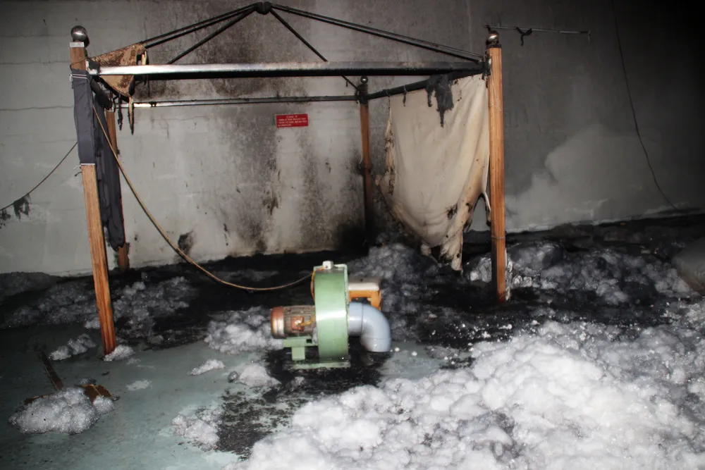 Hiện trường vụ cháy, vách tường nhà xưởng loang lổ, sập xệ...