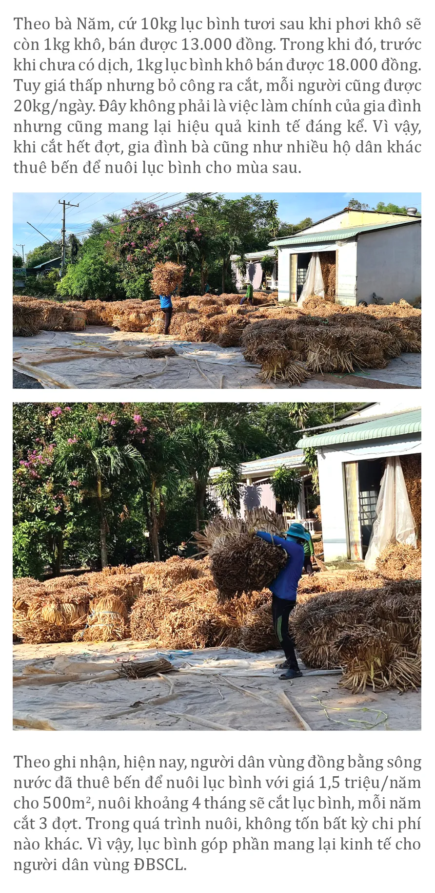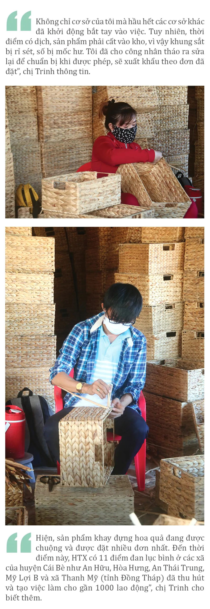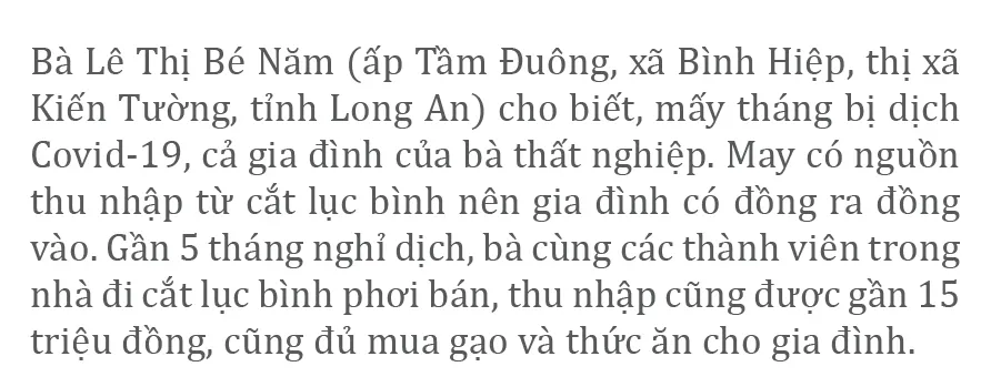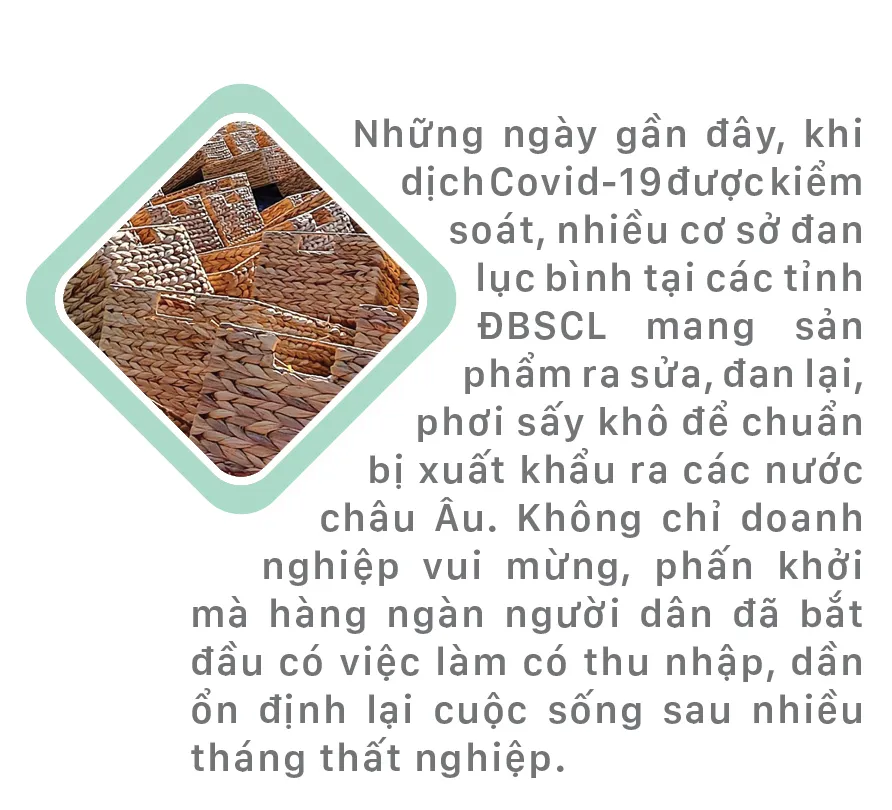Những ngày gần đây, khi dịch Covid-19 được kiểm soát, nhiều cơ sở đan lục bình tại các tỉnh ĐBSCL mang sản phẩm ra sửa, đan lại, phơi sấy khô để chuẩn bị xuất khẩu ra các nước châu Âu. Không chỉ doanh nghiệp vui mừng, phấn khởi mà hàng ngàn người dân đã bắt đầu có việc làm có thu nhập, dần ổn định lại cuộc sống sau nhiều tháng thất nghiệp.