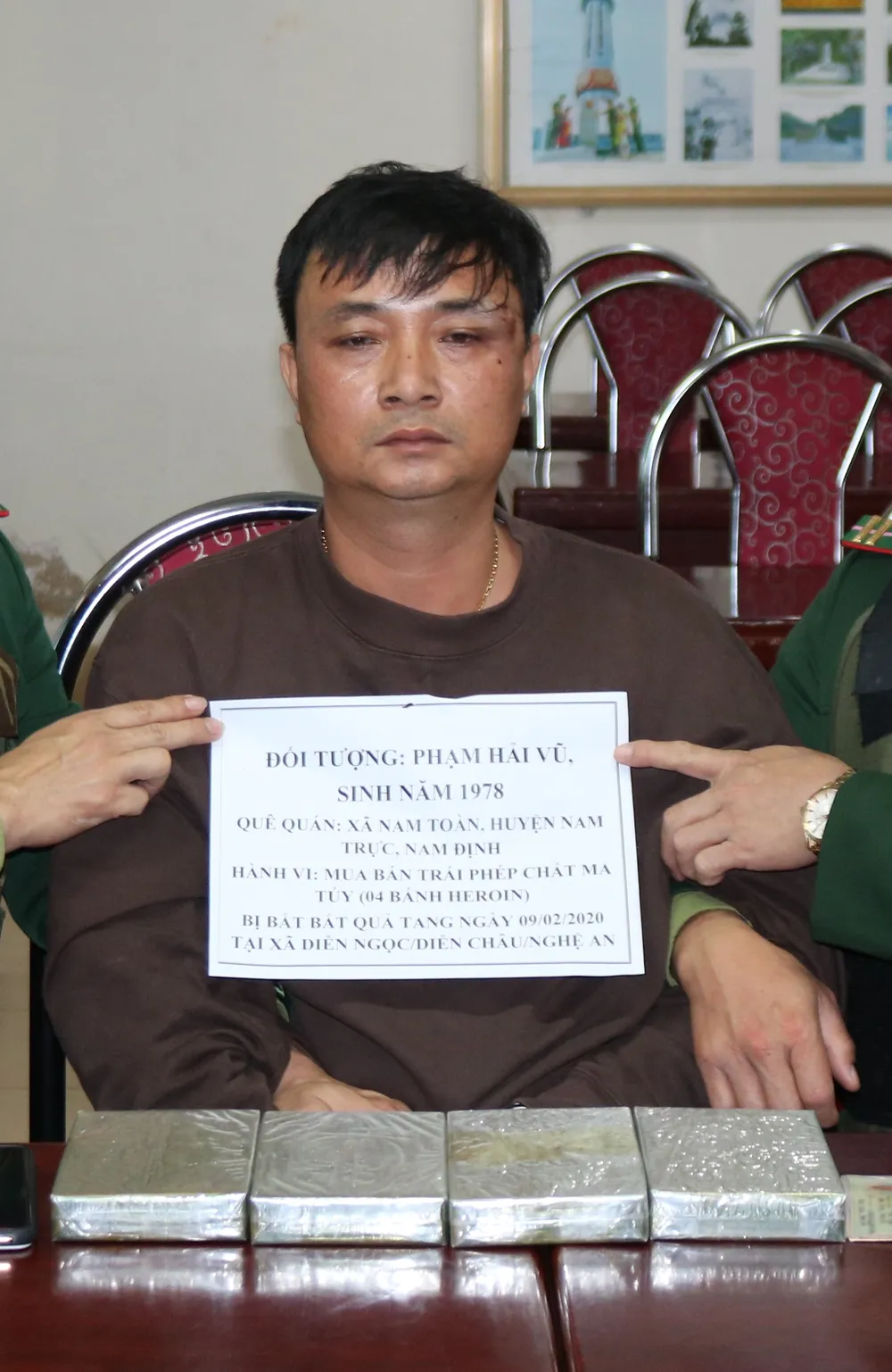 Theo đó, vào thời gian trên, tại xóm Trung Yên (xã Diễn Ngọc, huyện Diễn Châu, Nghệ An), các lực lượng đặc nhiệm của Cục Phòng chống ma túy và tội phạm miền Trung; miền Bắc và các Đồn Biên phòng Hạnh Dịch, Diễn Thành (thuộc Bộ đội Biên phòng Nghệ An) bắt được đối tượng Phạm Hải Vũ (33 tuổi, trú tại TP Nam Định, tỉnh Nam Định) đang vận chuyển trái phép chất ma túy.