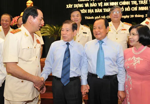 Bí thư Thành ủy TPHCM Lê Thanh Hải và Bộ trưởng Bộ Công an Trần Đại Quang, các đồng chí lãnh đạo TPHCM trao đổi cùng các đại biểu về dự hội thảo. Ảnh Việt Dũng