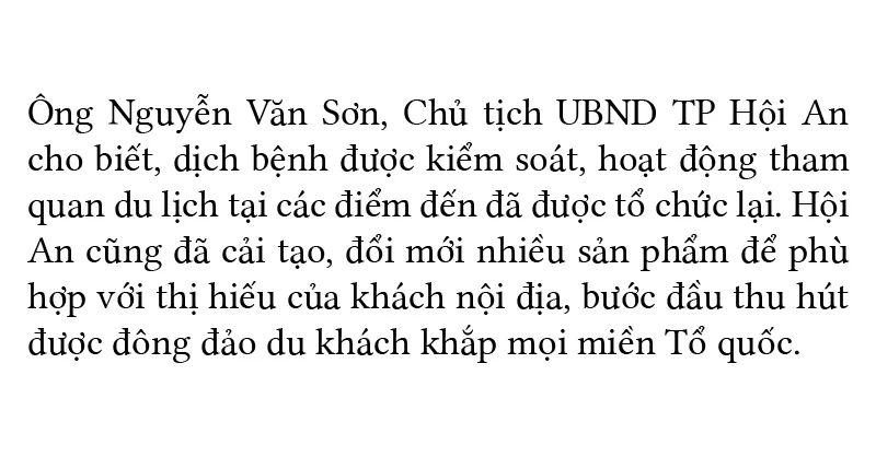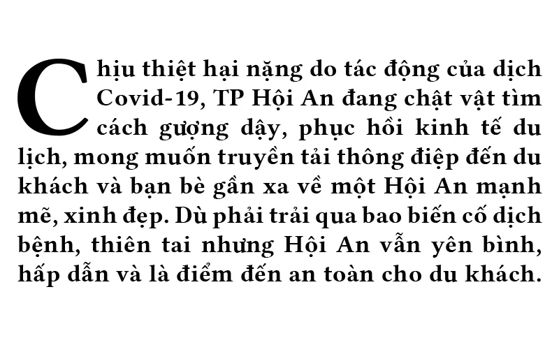 Chịu thiệt hại nặng do tác động của dịch Covid-19, TP Hội An đang chật vật tìm cách gượng dậy, phục hồi kinh tế du lịch, mong muốn truyền tải thông điệp đến du khách và bạn bè gần xa về một Hội An mạnh mẽ, xinh đẹp. Dù phải trải qua bao biến cố dịch bệnh, thiên tai nhưng Hội An vẫn yên bình, hấp dẫn và là điểm đến an toàn cho du khách.