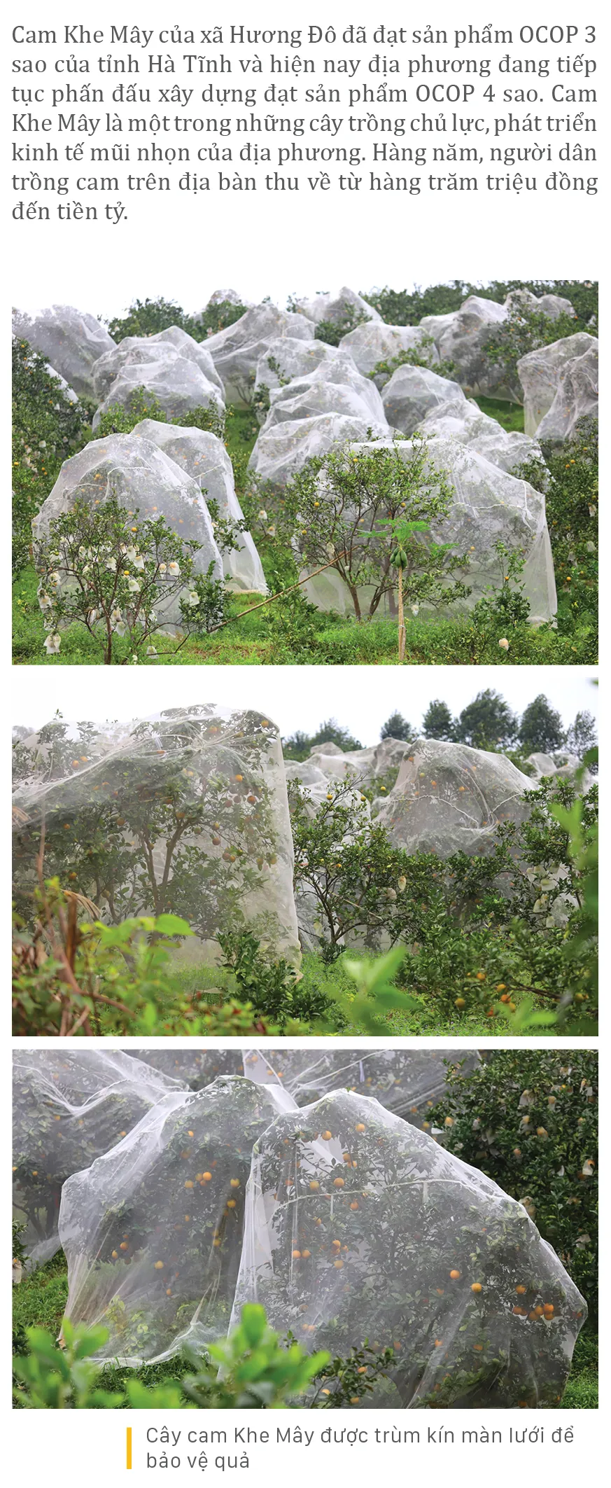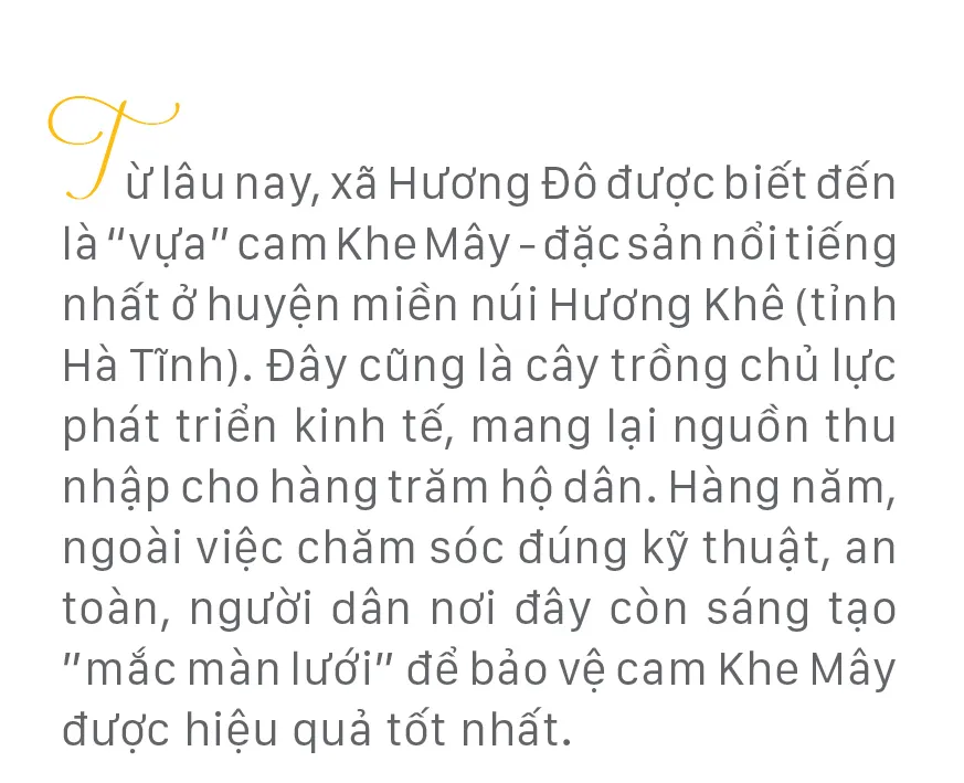 Từ lâu nay, xã Hương Đô được biết đến là “vựa” cam Khe Mây - đặc sản nổi tiếng nhất ở huyện miền núi Hương Khê (tỉnh Hà Tĩnh). Đây cũng là cây trồng chủ lực phát triển kinh tế, mang lại nguồn thu nhập cho hàng trăm hộ dân. Hàng năm, ngoài việc chăm sóc đúng kỹ thuật, an toàn, người dân nơi đây còn sáng tạo "mắc màn lưới" để bảo vệ cam Khe Mây được hiệu quả tốt nhất.