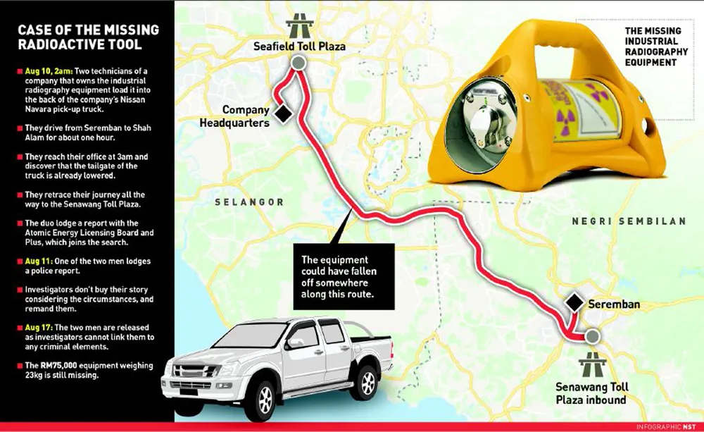 Cảnh sát Malaysia thông báo đang khẩn trương tìm kiếm một thiết bị phân tán phóng xạ (RDD) bị mất tích từ hôm 10-8.
