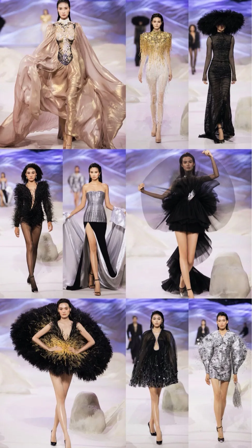 Đầm quây ngực ánh bạc đơn giản mà cuốn hút. Đầm dạ tiệc kèm mũ trùm đầu mang hơi thở của thời kỳ Trung cổ. Váy bất đối xứng được tạo nên từ vô số lớp vải xòe bồng bềnh. Catsuit đính lông vũ phấp phới theo những bước chân của người mẫu.