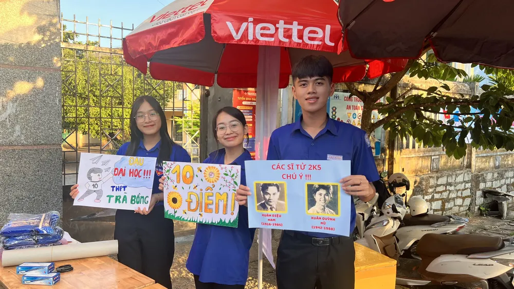 | Tiếp sức cho các thí sinh tại điểm thi Trường THPT Vạn Tường. Ảnh: NGUYỄN TRANG |