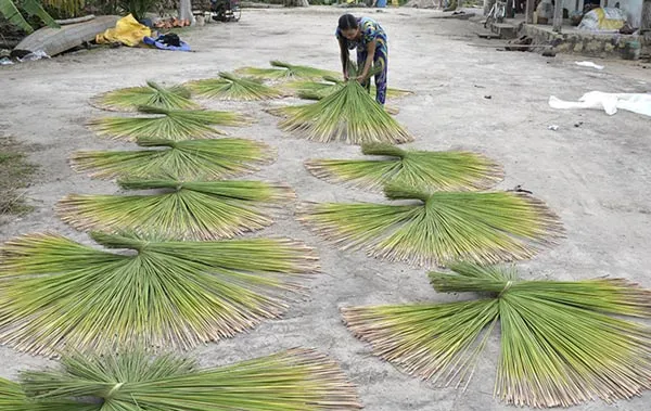 Chúng tôi đến cánh đồng cỏ bàng xã Phú Mỹ khi mặt trời vừa nhú lên khỏi chân vườn xa tít. Những tia nắng vàng lấp lánh buổi sớm mai rọi xuống một màu xanh mượt trên cánh đồng cỏ bàng mênh mông đến cuối tầm nhìn. Xã Phú Mỹ, khu vực biên giới Việt Nam - Campuchia với đa số người dân thuộc dân tộc Khmer, là xã nghèo vùng sâu, vùng xa của huyện Giang Thành. Đời sống của bà con chủ yếu là làm ruộng và đan cỏ bàng. Buổi sáng ở làng quê biên giới khá tĩnh lặng, chỉ có tiếng chim hót trên cành và tiếng gió vi vu, xao xác hàng cây dọc theo con kênh đào dùng để lọc phèn trên vùng đất ngập mặn. Nhưng phía sau không gian ngỡ như chìm lắng đó, là cả một không khí làm việc, tuy không hối hả, ồn ào, nhưng cũng vất vả, nhọc nhằn như bao ngành nghề khác. Nhưng với những người thợ đan cỏ bàng, đây lại là công việc đầy hứng thú, một công việc lập đi, lập lại qua bao thế hệ. Từ sáng sớm, trước sân nhà, nhiều người đã đem cỏ bàng ra phơi. Thao tác phơi cỏ bàng quả là một hình ảnh nghệ thuật độc đáo. Dựng đứng bó cỏ, xóc lại cho bằng đầu, buộc trên đầu mỗi bó bằng nuộc dây cũng bằng cỏ bàng, nhẹ nhàng quăng bó cỏ xuống đất thành một vòng tròn đều tăm tắp. Cả sân phơi biến thành tác phẩm nghệ thuật đắt giá trước mắt các nhiếp ảnh gia. Chúng tôi vào làm quen với một phụ nữ đang phơi cỏ bàng trước sân nhà. Chị tên Phàn, 37 tuổi, vậy mà tay nghề đan cỏ bàng có đến 30 năm. Từ thuở mới lên 6-7 tuổi, chị đã cùng cha mẹ, anh em đi nhổ cỏ về phơi, giã, để đan thành những sản phẩm dùng hàng ngày như nón, giỏ xách, chiếu đệm… Bây giờ công việc tiến bộ hơn, người thợ dùng máy để ép bàng, không còn giã như trước. Những sản phẩm làm ra cũng cao cấp hơn, được xuất khẩu ra nhiều nước trên thế giới. Trong căn nhà ba gian của chị Phàn, các thành viên trong gia đình quây quần bên nhau đan cỏ bàng thành từng tấm có kích thước 2m x 0,60m, bán cho xưởng với giá 60.000 đồng/tấm. Một người đan giỏi sẽ hoàn thành 2 tấm/ngày. Ông Thạch Tú, chủ nhà mời chúng uống trà, nói chuyện, tỏ ra phấn khích: “Cả cái xứ Phú Mỹ này, nhà nào cũng đan cỏ bàng. Nhà tôi làm nghề này đã 4 đời. Làng nghề truyền thống đan cỏ bàng có bao nhiêu năm, thì nhà tôi làm bấy nhiêu năm. Trước kia cực lắm, thu nhập không đủ sống, phải làm ruộng thêm. Bây giờ thì đỡ rồi, cả nhà làm một ngày kiếm được gần 500.000 đồng. Ở miền quê mà có bấy nhiêu là sống được”.