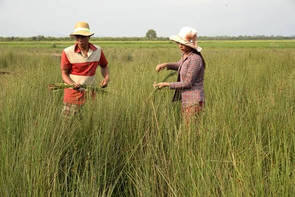 Chúng tôi thấy ngoài cánh đồng nhiều người đang nhổ cỏ bàng, liền đến hỏi chuyện. Vợ chồng anh Thạch Qua ngừng tay, nói: “Nhổ cỏ bàng phải đi từ sớm, nắng chưa gắt, đất còn mềm, sẽ nhổ nhẹ tay, không mất sức, khi nắng lên cao thì nghỉ”. “Cỏ bàng do mình trồng, hay thế nào?”, nghe tôi hỏi, anh cười ngất: “Cả cánh đồng gần 3.000ha, mọc tự nhiên, nhổ quanh năm biết bao đời rồi, cũng đâu có hết. Mỗi ngày cỏ bàng đâm chồi mọc thêm nhiều lắm”.