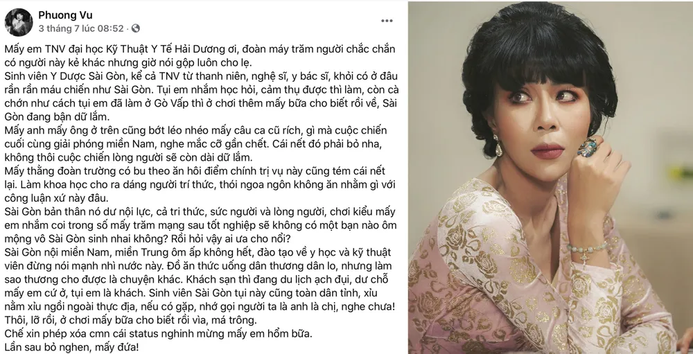 MC Trác Thúy Miêu và bài đăng trên Facebook cá nhân (Ảnh chụp màn hình FBNV)