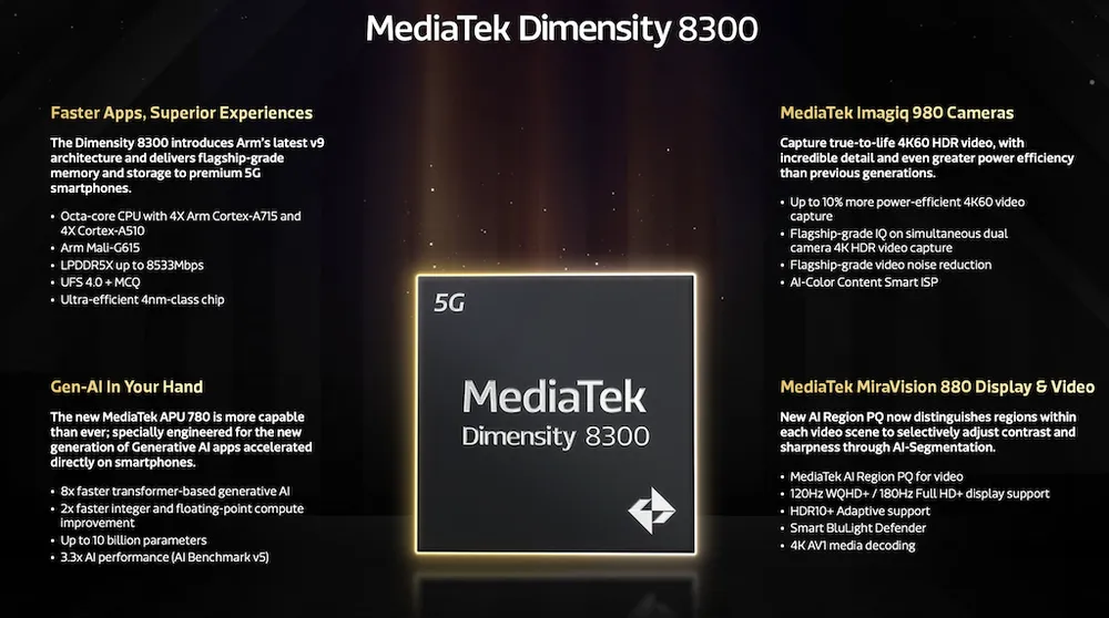 Dựa trên tiến trình 4nm thế hệ thứ hai của TSMC, Dimensity 8300 có một CPU tám lõi, với bốn lõi Arm Cortex-A715 và bốn lõi Cortex-A510 được xây dựng trên kiến trúc CPU v9 mới nhất của Arm. Nhờ cấu hình lõi mạnh mẽ này, Dimensity 8300 có hiệu suất CPU nhanh hơn 20% và hiệu suất sử dụng năng lượng tăng 30% so với vi xử lý thế hệ trước.