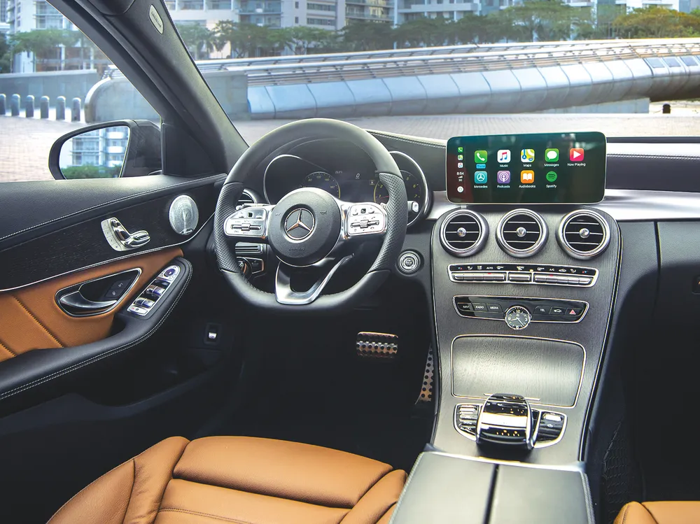 C-Class được nâng cấp theo hướng hiện đại hơn, trong đó 3 yếu tố nổi bật nhất là màn hình hiển thị, thiết kế tay lái và khả năng kết nối thông minh. Trên C 300 AMG, sự kết hợp của bảng đồng hồ tốc độ kỹ thuật số chất lượng cao kích thước 12,3 inch và màn hình giải trí trung tâm 10,25 inch mang đến trải nghiệm sắc nét, hiện đại cho người sử dụng. Cả 3 phiên bản đều được trang bị tay lái với thiết kế mới, tích hợp 2 nút điều khiển cảm ứng trên tay lái (Touch Control Buttons), giúp người lái dễ dàng điều khiển các tính năng của xe mà không bị sao nhãng. Cả 3 phiên bản đều hỗ trợ sạc điện thoại không dây qua chuẩn Qi và kết nối Apple CarPlay/Android Auto. C-Class cũng đã có thiết kế chìa khóa và nút Khởi động sang trọng, tinh xảo hơn.