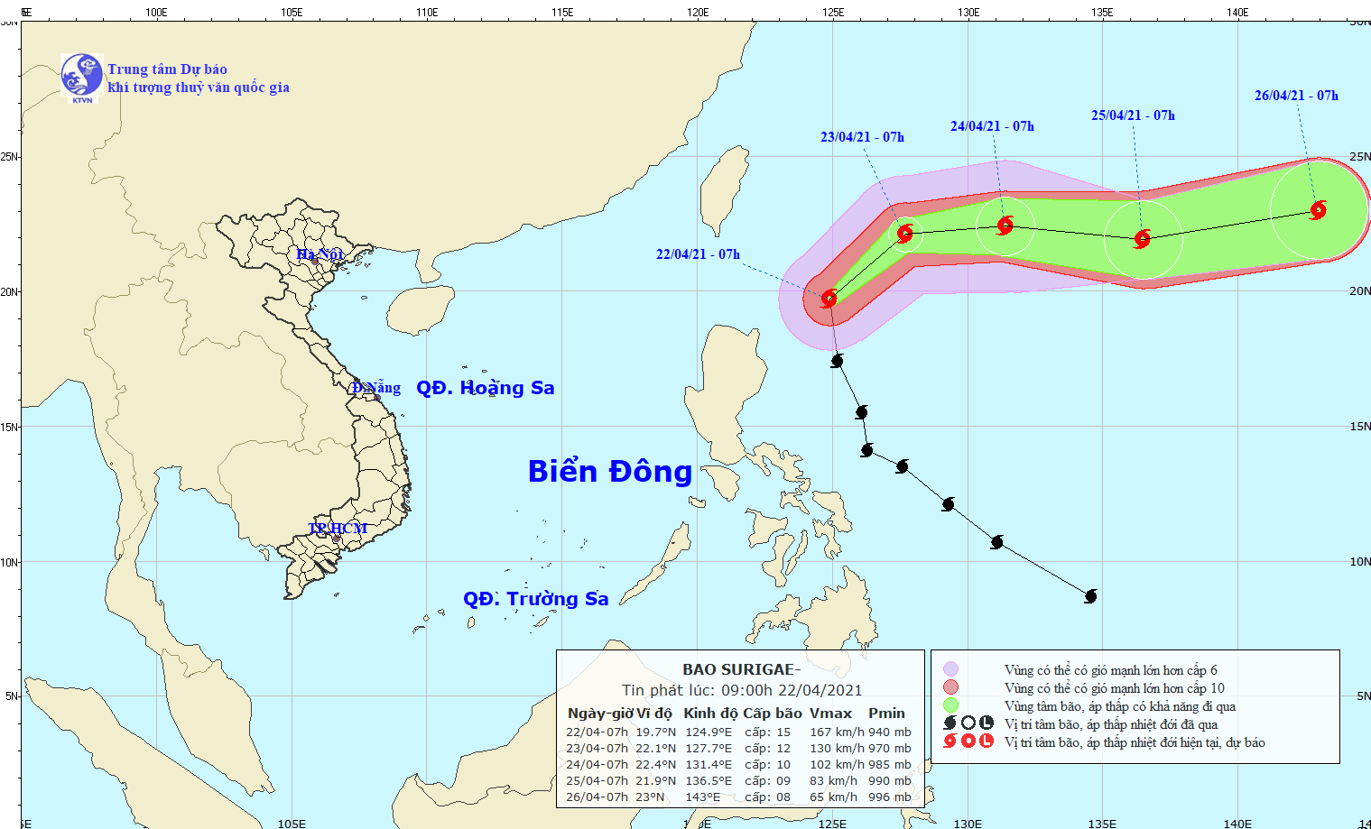 Ngày 22-4, Trung tâm Dự báo Khí tượng - Thủy văn Quốc gia thông báo: "Bão Surigae rất ít có khả năng đi vào Biển Đông và hầu như không ảnh hưởng đến đất liền Việt Nam".