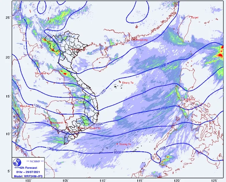 Ở miền Bắc, mặc dù khu vực Đông Bắc bộ và đồng bằng sông Hồng đang xuất hiện đợt nắng nóng nhẹ nhưng theo quan trắc chiều 28-7, tại vĩ độ khoảng 22-25 độ Bắc xuất hiện một rãnh áp thấp đang hạ trục dần xuống phía Nam.