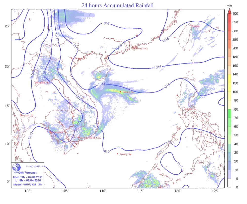 Theo đó, do ảnh hưởng của rãnh áp thấp có trục ở khoảng 5-8 độ vĩ Bắc, nên hôm nay (8-4) và ngày mai (9-4), ở các tỉnh Tây Nguyên và Nam bộ có khả năng xuất hiện mưa rào và dông, cục bộ có mưa vừa, mưa to. Thời gian mưa tập trung vào chiều tối và đêm. Trong mưa dông có khả năng xảy ra lốc, sét, mưa đá và gió giật mạnh.