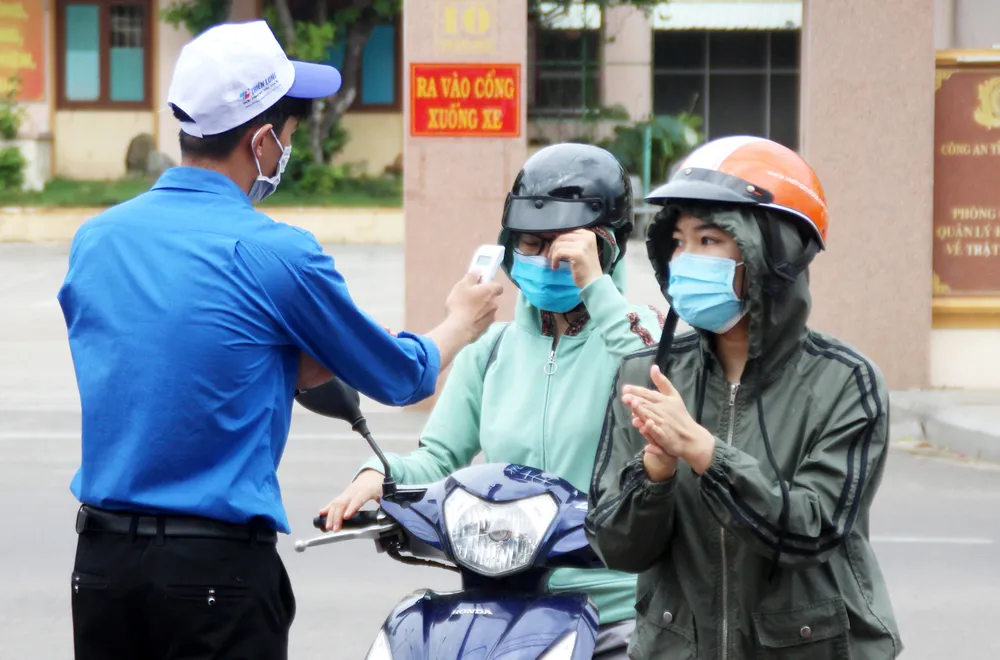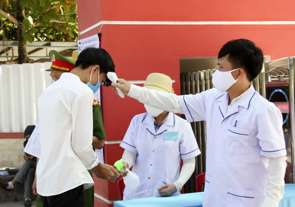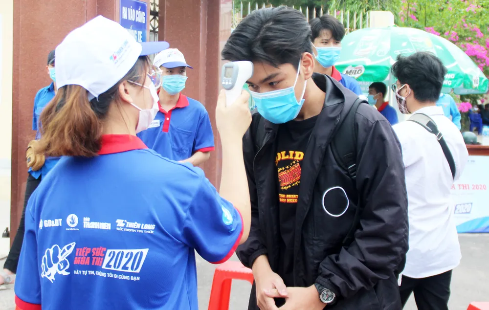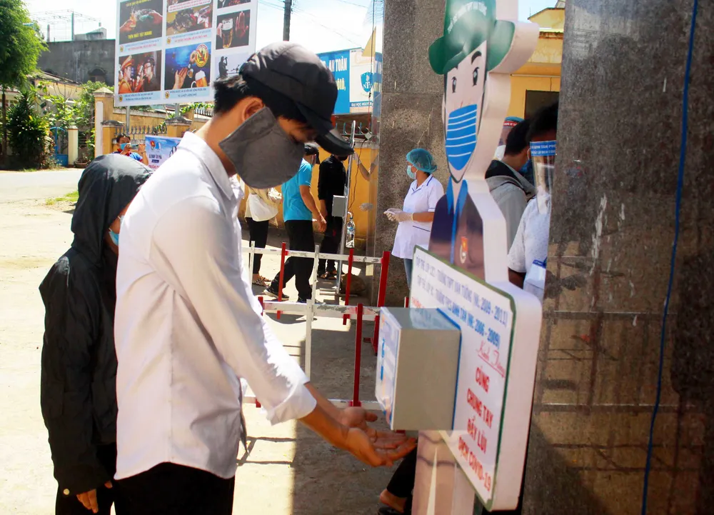 Tại điểm thi Trường THPT Vạn Tường (huyện Bình Sơn, Quảng Ngãi) các cán bộ y tế, đoàn thanh niên, cán bộ ngành giáo dục đã túc trực từ sớm để hướng dẫn các thí sinh đo thân nhiệt, rửa tay, sát khuẩn trước khi vào phòng thi.