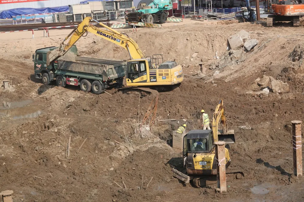 Công nhân thi công tại khu vực gần cầu Trần Thị Lý làm việc giữa nắng nóng, trang bị kín để chống nắng và đảm bảo tiến độ