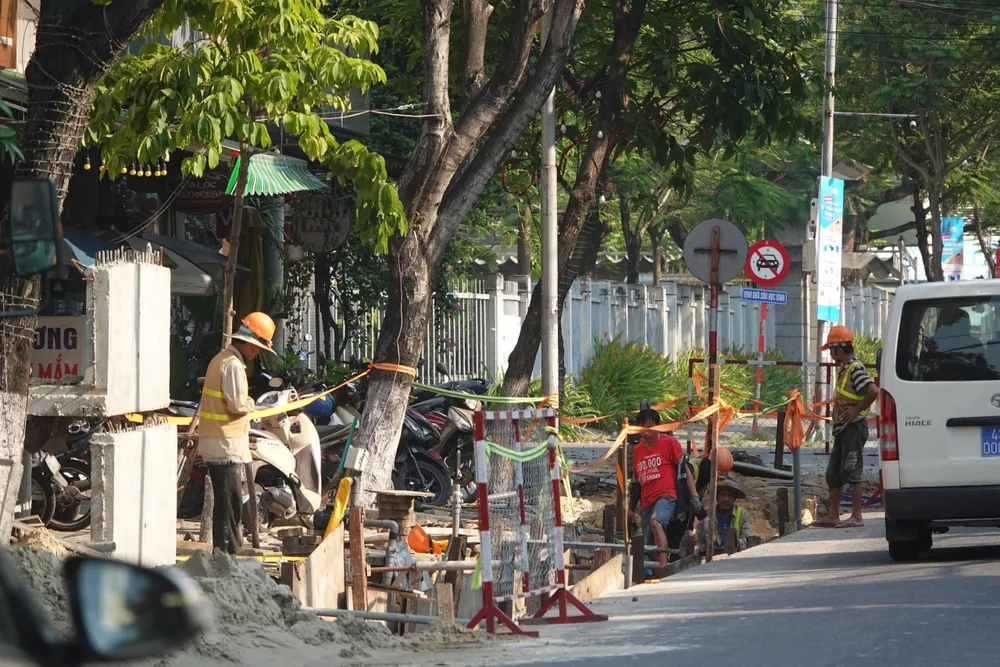 Công nhân thi công tại khu vực đường Lê Lợi làm việc giữa nắng nóng