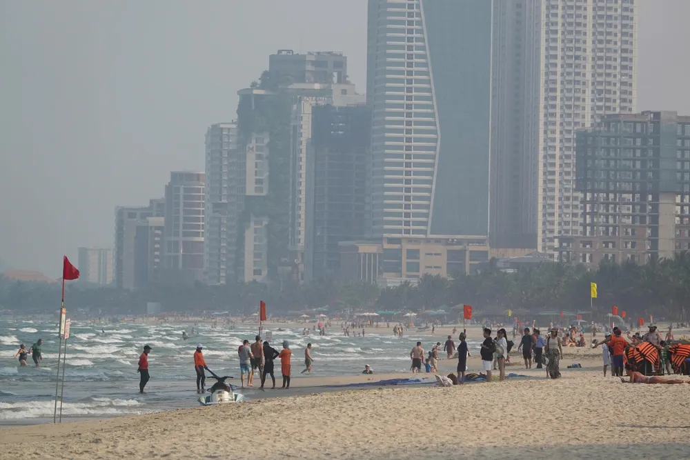 Người dân, du khách tắm biển tại bãi biển đường Võ Nguyên Giáp (Đà Nẵng) vào chiều muộn để giải nhiệt