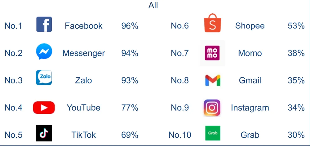 Theo báo cáo “Ứng dụng di động phổ biến nhất Việt Nam 2023” của Q&Me, người Việt Nam dành khoảng 6,2 giờ/ngày cho việc sử dụng điện thoại thông minh. Trung bình trong một tuần, mỗi người Việt sử dụng 20,5 ứng dụng. Trong đó, 2/3 thời gian được sử dụng cho các ứng dụng mạng xã hội và nhắn tin. Cụ thể, 6/10 cái tên xuất hiện trong “Top 10 ứng dụng di động phổ biến nhất” về số lượng người dùng đều là các ứng dụng quen thuộc như Facebook, Messenger, TikTok, Youtube, Instagram…
